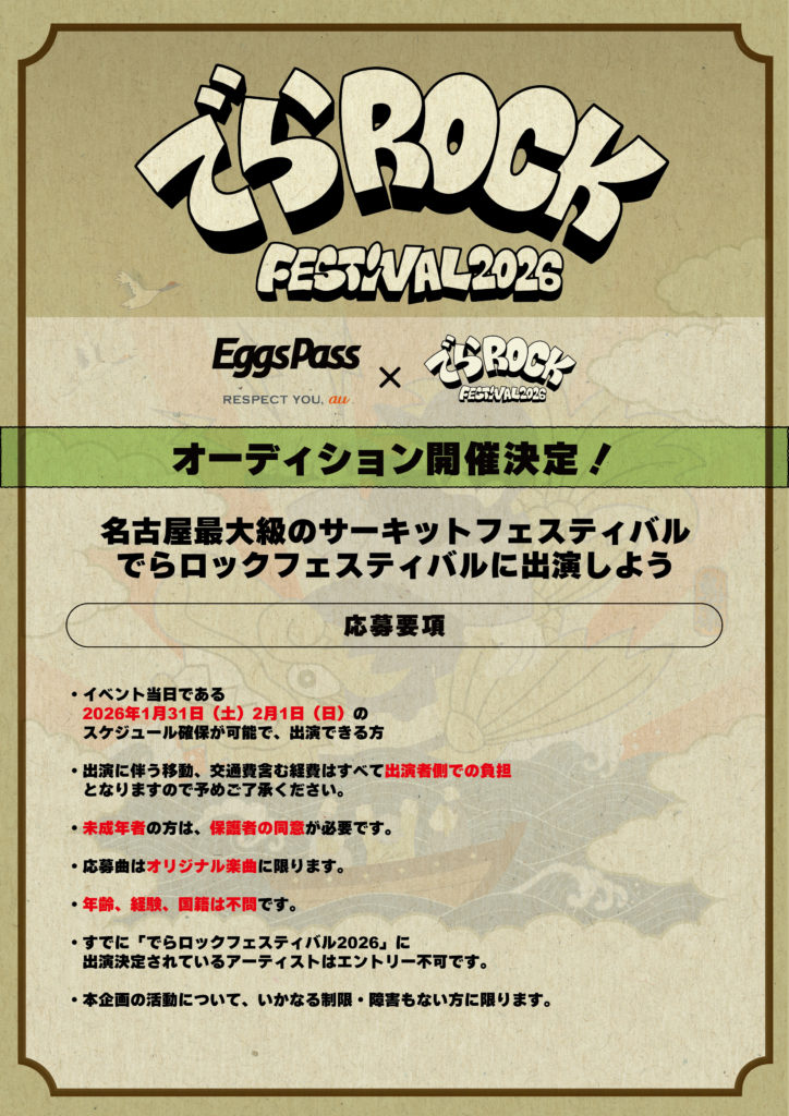 2026年 1月31日(土)・2月1日(日) 名古屋冬の超大型サーキットフェス Eggs Pass × でらロックフェスティバル 2026 オーディション開催決定